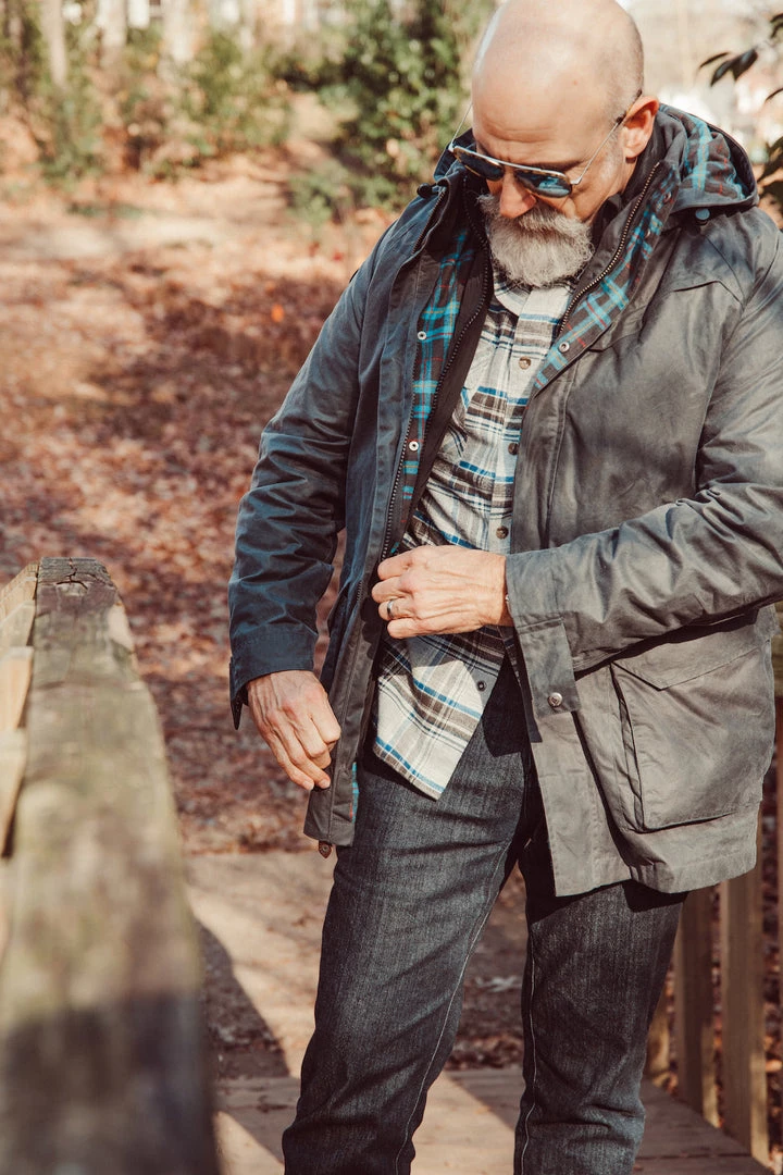 We are proud to introduce to you our first ever wet wax cotton jacket: The Warner Heritage Jacket. This heritage piece wears with you over time, offering premium durability. The Warner Heritage Jacket is an all-American take on a traditional British style. A lifetime jacket that ages with you and always has your back through it all. This jacket is 10.2oz 100% cotton, and is fully lined with our iconic Mountain Khakis brushed flannel plaid. A detachable 3-panel hood provides full head coverage, with a ribbed interior collar for maximum comfort. You’ll find 6 pockets: 1 mountain peak chest pocket, 1 interior chest pocket, 2 deep hand pockets which are fleece-lined for warming up your hands, and 2 side entry pockets. We’ve included zip-in compatibility for 2-in-1 layering with the Lynx which makes this jacket a true year-round companion. The Warner is finished with premium metal trims, a leather zipper pull, and our iconic bison patch. We specifically chose to offer our program in Jackson Grey – this color is unique to the wax jacket category, and you won’t find it anywhere else.