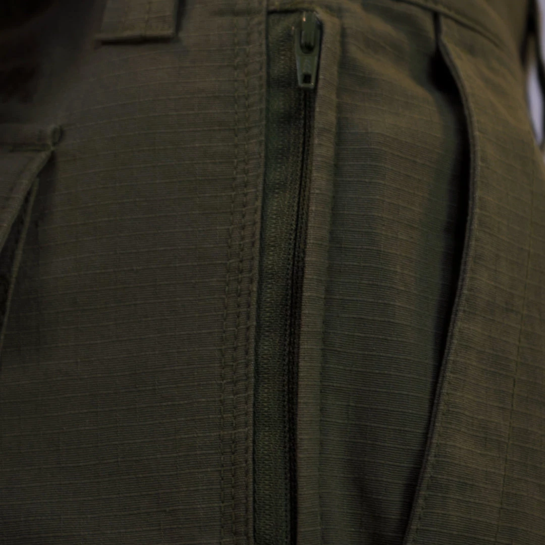 - Cargo style pocket with zipper closure on wearer’s right thigh