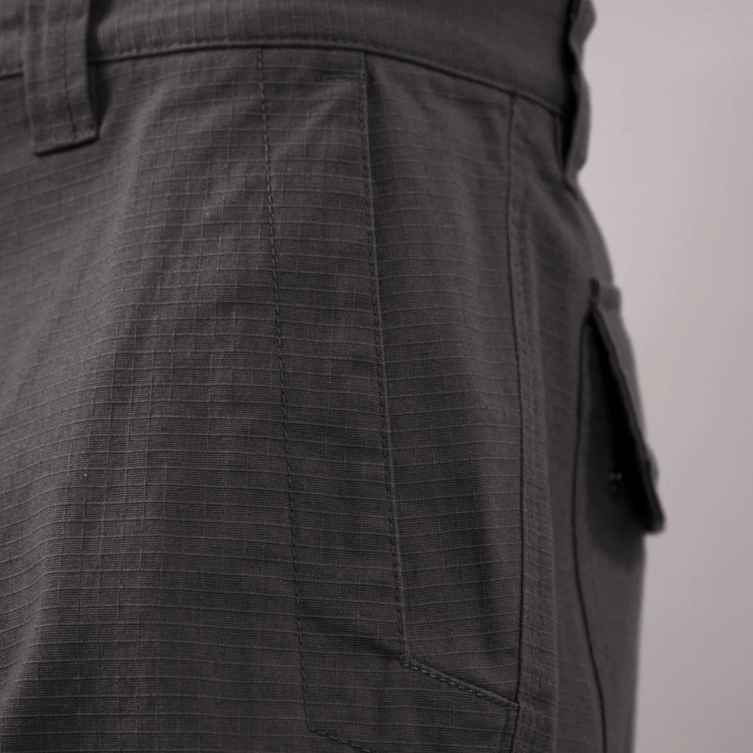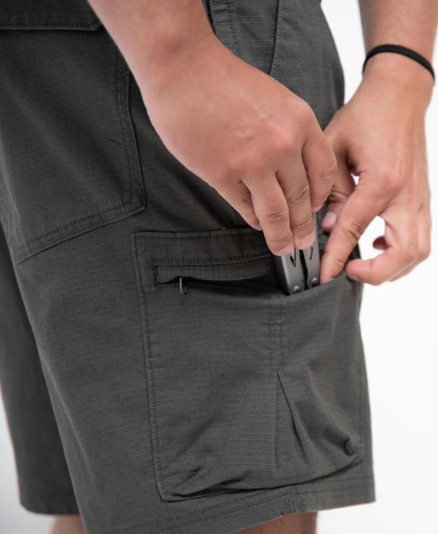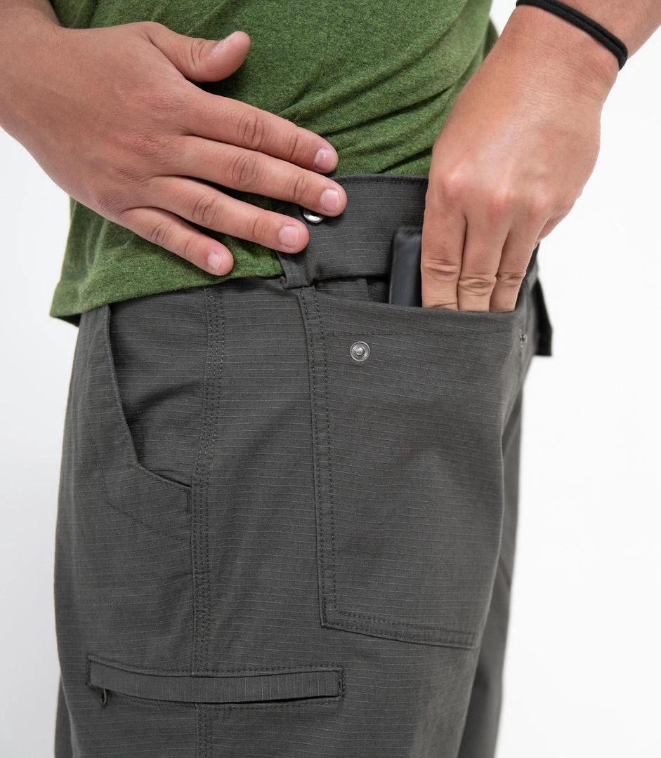 The Flint Utility Short is here to pair with your rugged summer exploits. We built this style as tough as we could make it while still keeping it functional and super comfortable. Abrasion-resistant ripstop fabric resists wear and tear and the Flint is packed with 7 pockets: 3 front hand pockets, 2 back pockets with snap closure, and 2 cargo-style thigh pockets.