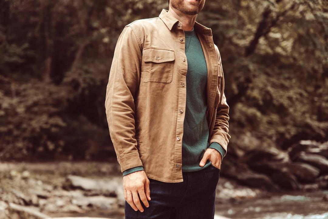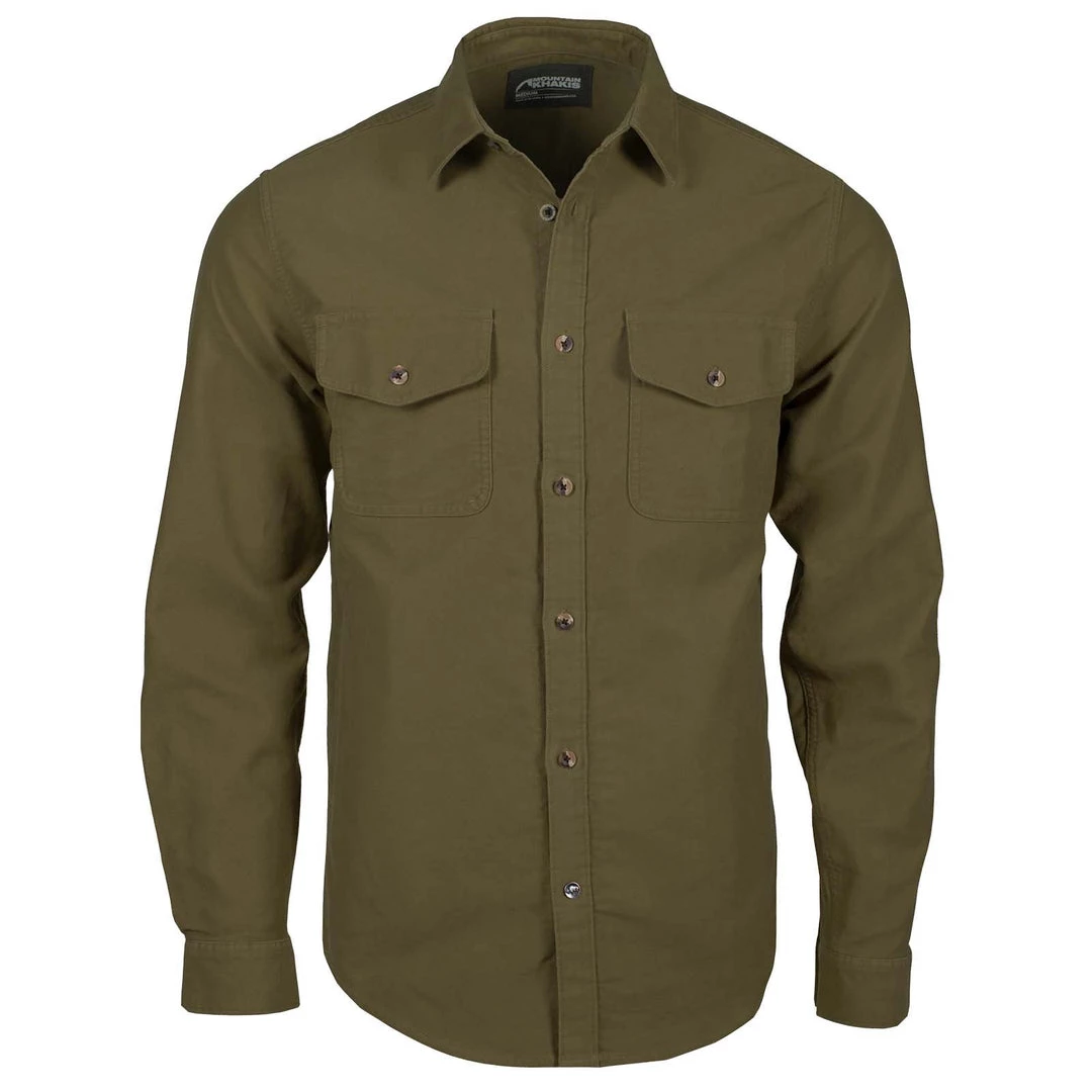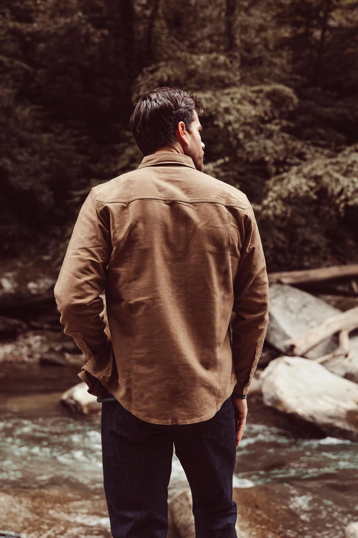 For a truly heritage feel and timeless look, dive in to our 7.4oz 100% cotton Moleskin Shirtjac. This heavy cotton fabric is woven and then sheared to create a short soft pile on one side. Outstandingly comfortable, stylish and plays well with anything in your wardrobe. The feel and appearance of its texture is similar to chamois, but less plush than velour. Graced with two chest pockets with button closure plus two onseam hand pockets, branded faux horn buttons and a custom bison snap on the bottom placket.