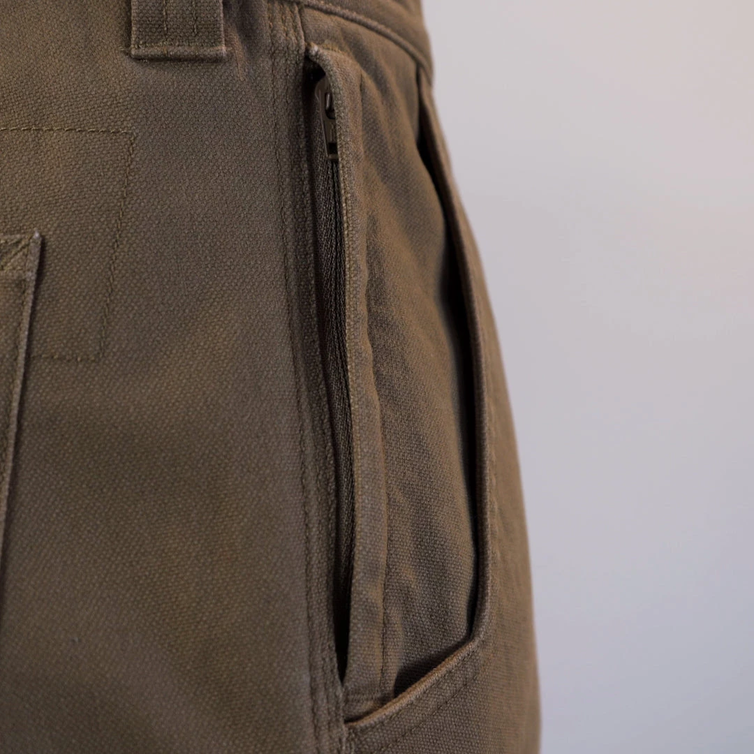 - Hidden side seam deep drill hand pocket with zipper closure for added security